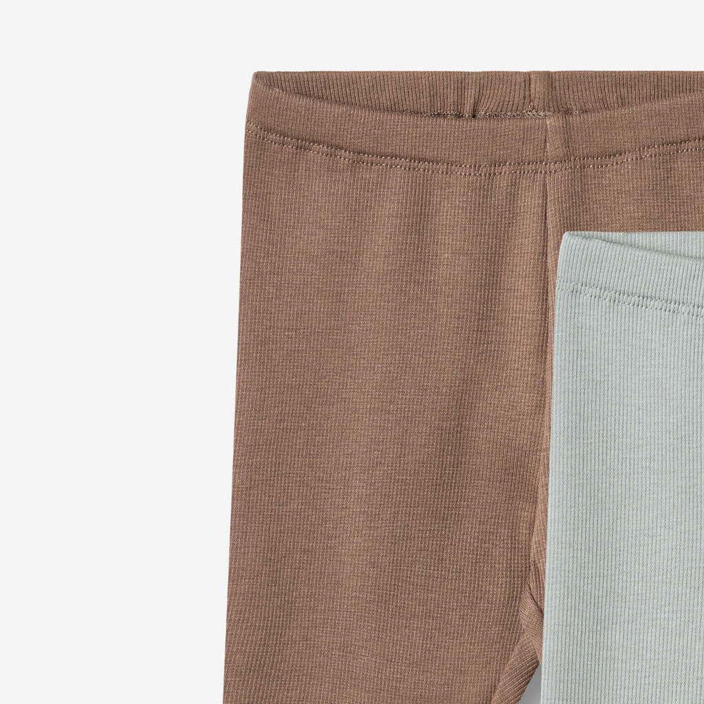 2-pakning med ribbestrikkede leggings i myk økologisk bomull til babyen din. - Tettsittende- Elastisk linning- Ribbestrikket struktur- 2 forskjellige ensfargede farger Wheats nydelige og myke leggings er unisex og et virkelig essensielt plagg i barnets garderobe. Leggingsene er tettsittende og har en elastisk linning. De er også perfekte som pysjamas på kaldere netter.