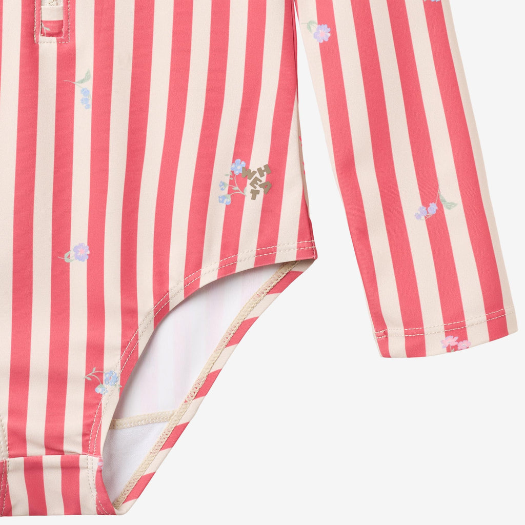 Langarmet badedrakt med print designet for komfort og moro for barn. - Brettet krage- Glidelås halvveis ned foran med hakebeskyttelse- Myk elastikk ved benåpningene- SignaturprintBadedrakten sikrer en tettsittende passform og tillater ubegrenset bevegelse under vannaktiviteter. Perfekt for en dag på stranden eller i svømmebassenget. All vår badetøy er hovedsakelig laget av resirkulert polyester og er behagelig for barnet ditt å ha på seg og bevege seg i.Stilen har UV 40+/UPF 40+ beskyttelse.