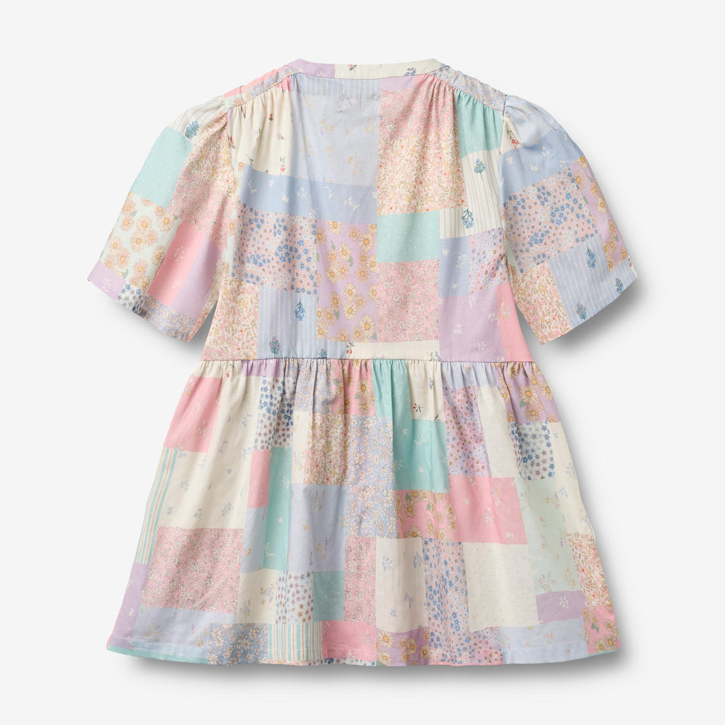 Kortermet kjole med trykt patchwork i myk økologisk bomull for barn. - Vide ermer- Smal mandarinkrage- Panelet på skuldrene - Samlinger i ermehullet- Splitt foran- Skjæring med samlinger nedenfor- Trykt patchwork En vevd sommerkjole er et must-have for solfylte dager. Lett, luftig og designet for ubesværet bevegelse, den er perfekt for varme vær-eventyr. Med delikate detaljer og sjarmfulle mønstre fanger denne kjolen sommerens essens, enten det er til hverdagslige leker eller spesielle anledninger. En unik metervare med håndtegnede trykk utvalgt fra kolleksjonen og satt sammen til et stort patchwork-trykk.