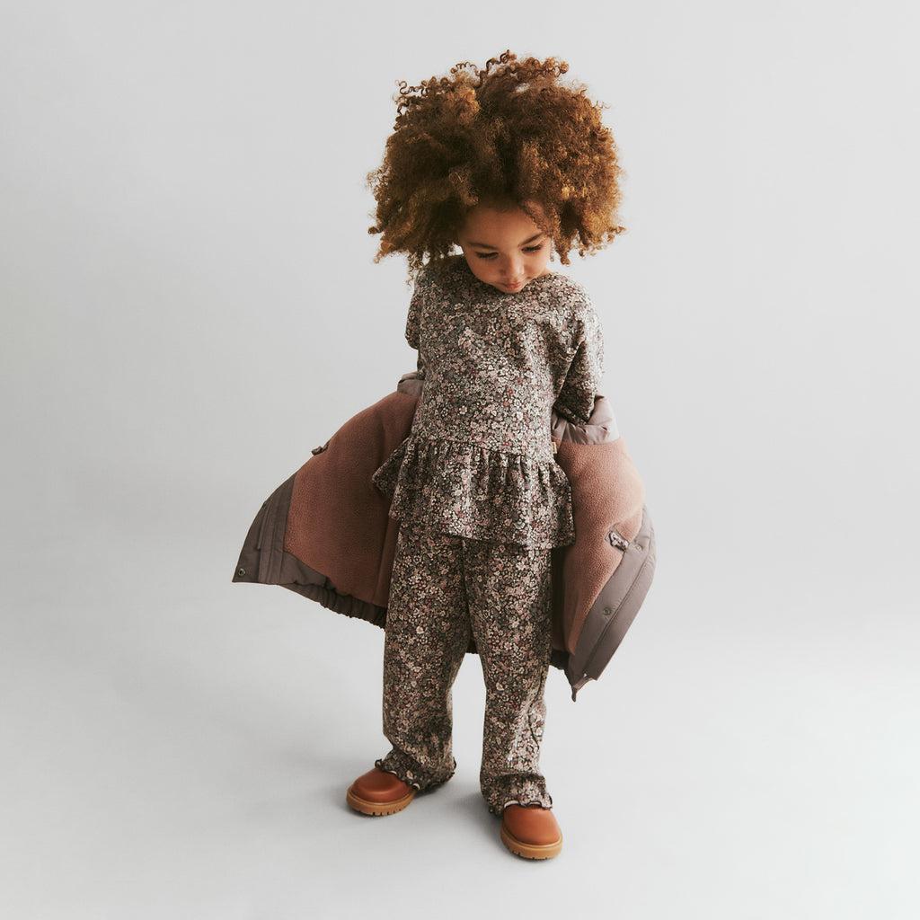 Behagelige trykte jerseybukser i myk økologisk bomull for barn.- Vanlig/ løs passform- Vide ben- Justerbar elastikk i midjen- Wheat-signaturtrykkWheats herlige myke bukser er både søte og komfortable for barnet ditt å ha på, og kan enkelt styles under en av våre kjoler eller med en T-skjorte eller strikketøy. De myke buksene har en avslappet passform øverst og blir videre nedover beinet.
