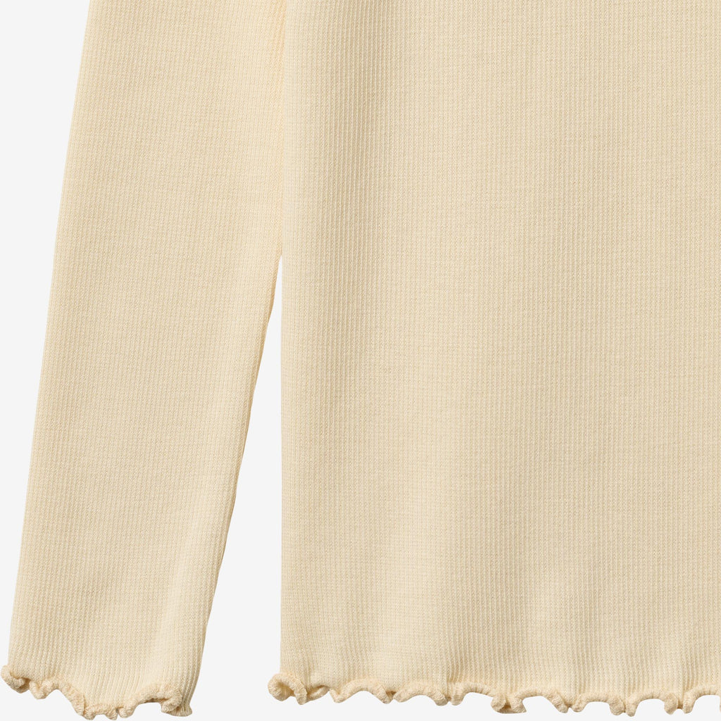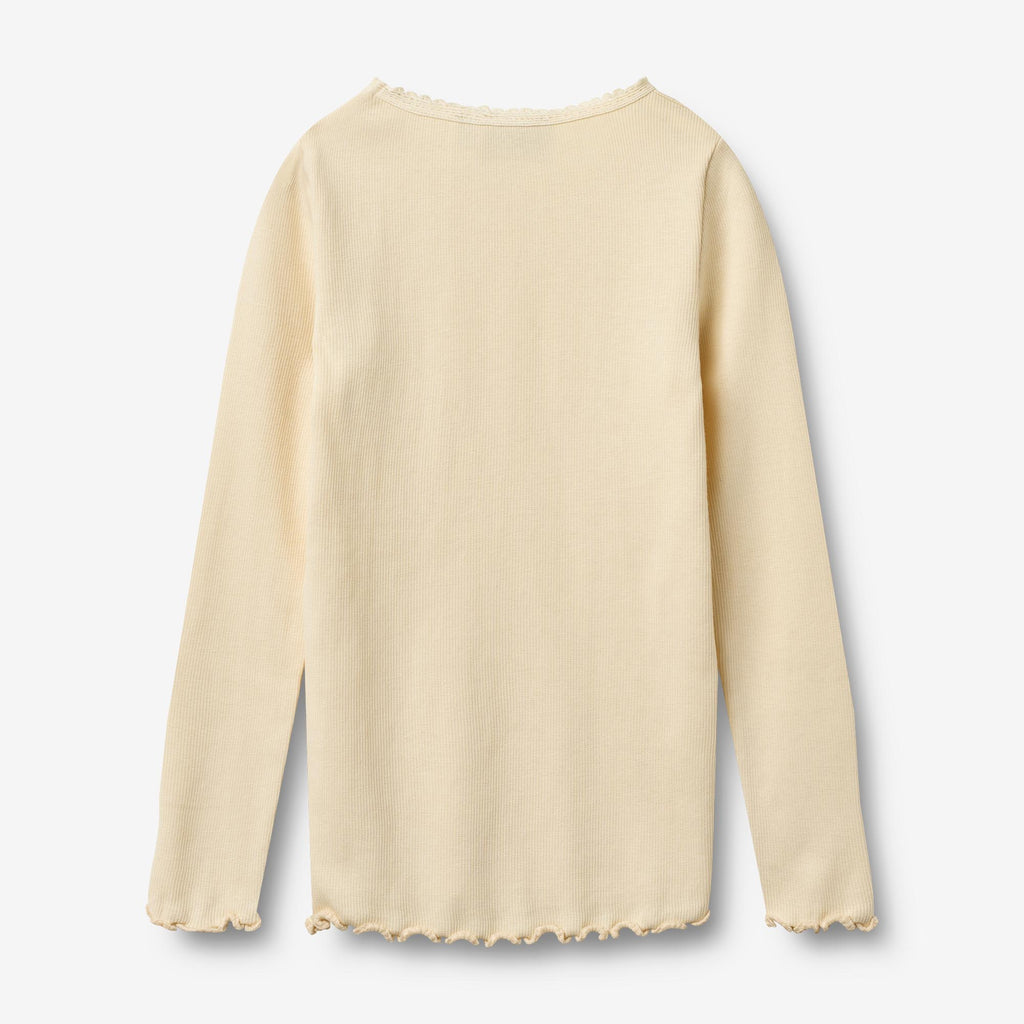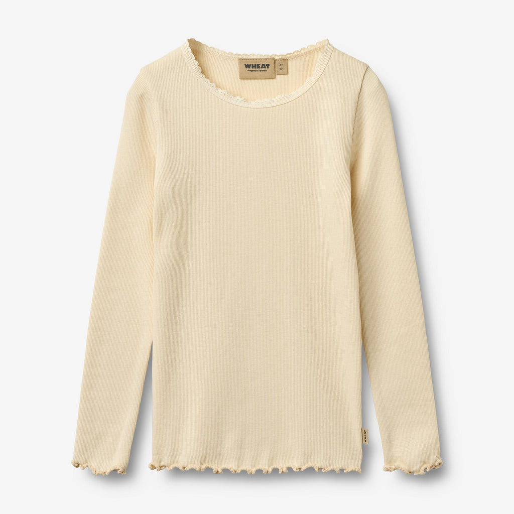Langermet ribbestrikket T-skjorte i en myk blanding av økologisk bomull og Lenzing modal for barn.- Tettsittende og elastisk- Blonde-detaljer ved halsen- Overlocksøm ved mansjetter og nederkant- Ribbet strukturT-skjorter er et viktig plagg i garderoben til barnet ditt, da T-skjortene er myke og behagelige å ha på. T-skjortene er tilgjengelige i vakre farger og håndtegnede mønstre, som er laget av Wheat's interne designteam. De kan enkelt styles med bukser eller en skjørt, eller med en strikkegenser på toppen avhengig av vær og anledning. De er også perfekte som et ekstra lag under en kjole eller overall på kjøligere dager.