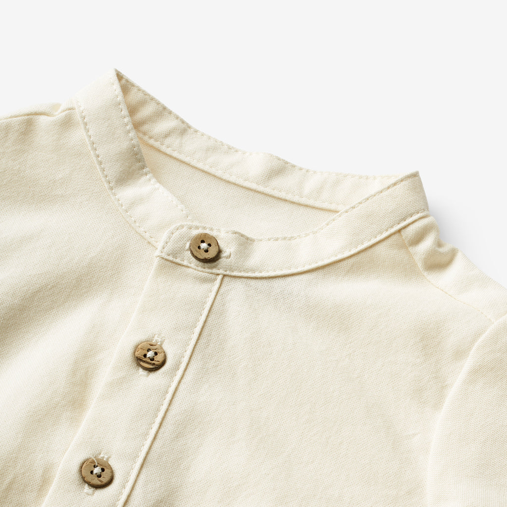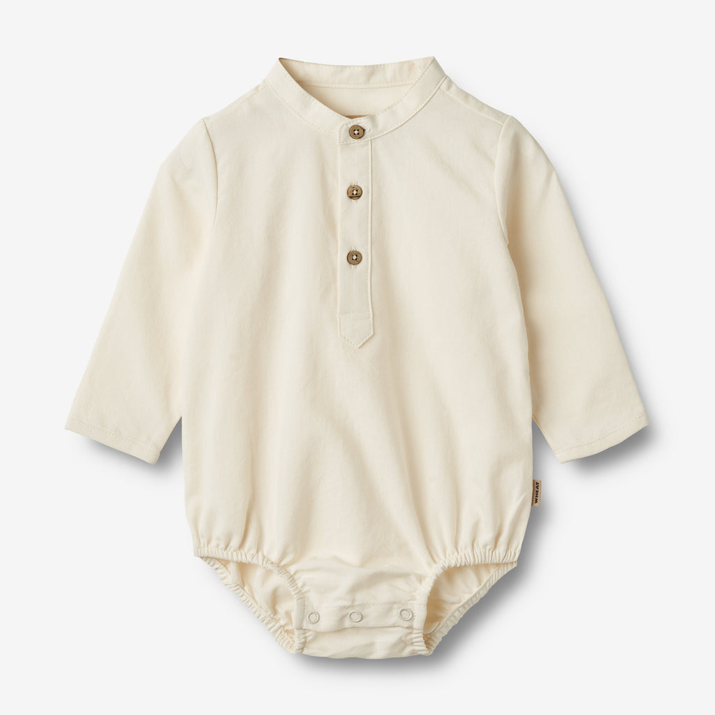 Langermet romper-skjorte i myk, økologisk bomull til babyen din.- Vanlig passform- Mandarin-krage- Knapper halvveis ned foran- Strikk i benåpningene- Trykknapper i skrittetDenne søte romperen tilfører litt ekstra sjarm til babyens garderobe. Den er behagelig å ha på og har trykknapper nederst, som gjør det enklere å kle på og av babyen. Perfekt for både spesielle anledninger og koselige dager gjennom høst- og vintersesongen.