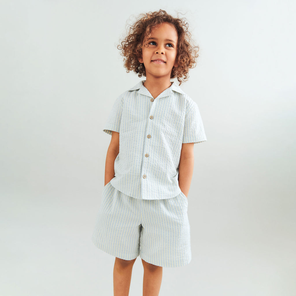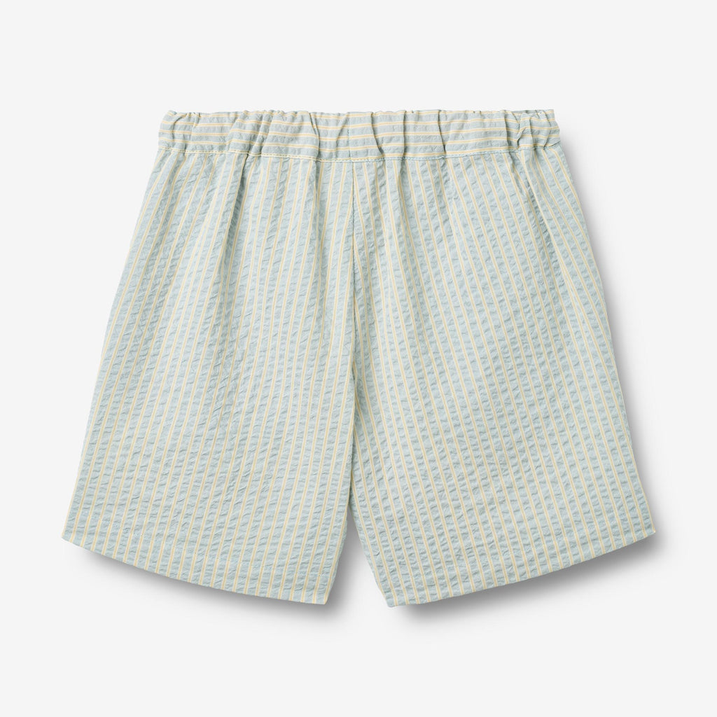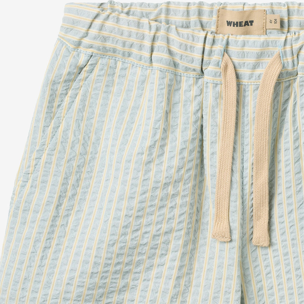 Myke shorts med striper i økologisk bomull for barn.- Normal/Løs passform- Sidelommer- Justerbar elastikk i midjen med snøring- Stripete seersuckerWheat's myke shorts er en essensiell del av ditt barns daglige antrekk med en praktisk elastikk i midjen og lommer. Shortsen har en løs og avslappet passform rundt bena, noe som gjør dem behagelige for barnet ditt å ha på seg og kan lett styles med en av våre T-skjorter, topper eller strikkeplagg for hverdagen. De er også perfekte for de mange spesielle anledninger, hvor du kan kle dem opp med en skjorte eller bluse for å fullføre det elegante utseendet.