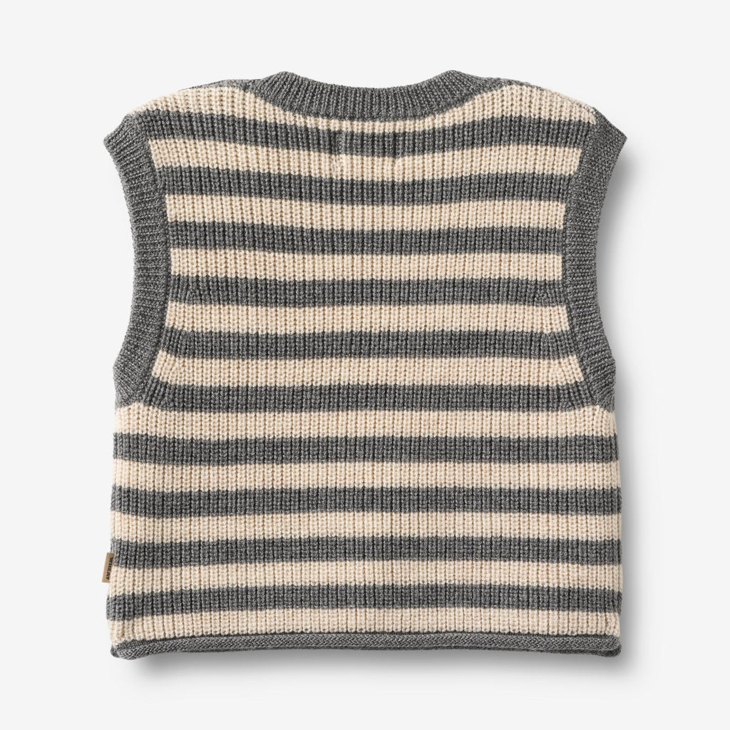 Strikkevest med striper i myk merinoull til babyen din. - Løs passform- Lave skuldre og store ermehull- Ribb i halsen, ermeåpninger og nederst- Knapper på venstre skulder for ekstra komfort- StripeteWheats strikkeplagg er helt nødvendig i de kalde høst- og vintermånedene, siden det er mykt og behagelig for babyen din å ha på seg uten noen form for kløe. Våre strikketøy har et klassisk utseende med en avslappet passform som gjør dem enkle å style med ethvert antrekk. Vesten er perfekt som et ekstra lag på kaldere dager og fungerer godt over en kropp, skjorte eller kjole til spesielle anledninger.