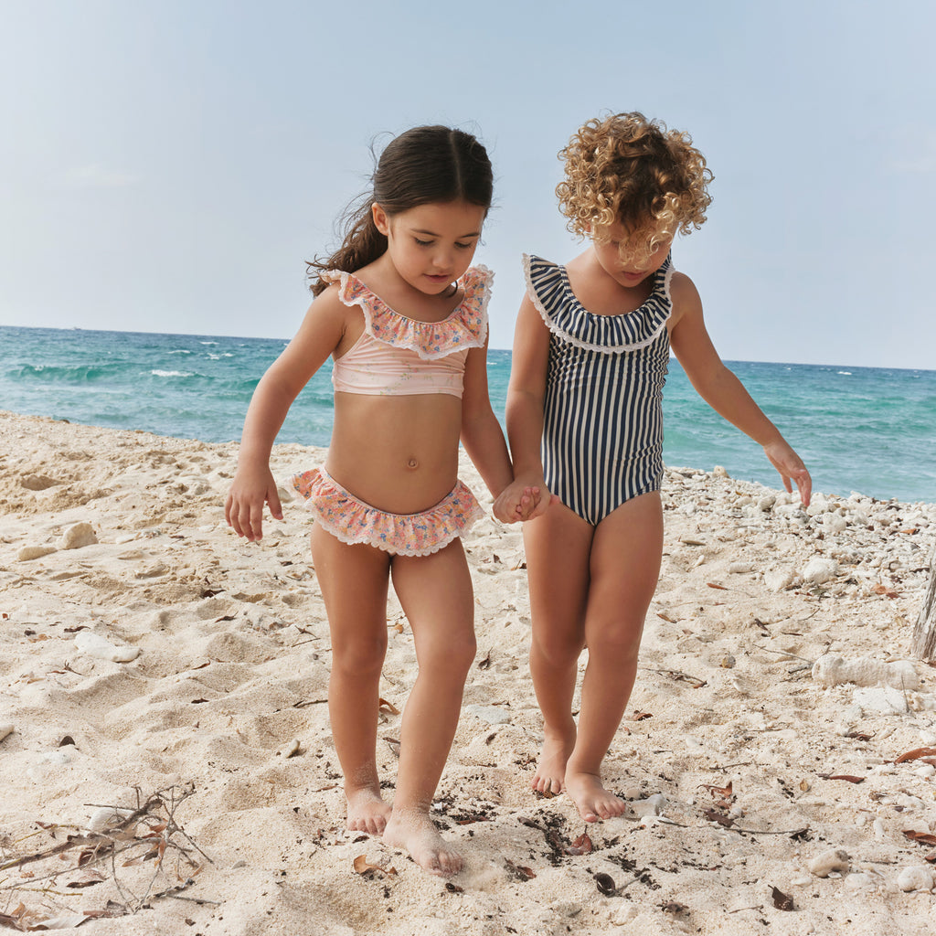 Vakker badedrakt med mønster for barn.- Figursydd- Blonde detaljer- Bred volang ved halsen og skuldrene- Lavere kutt på baksiden- Skulderstropper som krysser på baksidenWheat's badetøy er perfekt for en dag på stranden eller svømmebassenget. Alt vårt badetøy er hovedsakelig laget av resirkulert polyester og er behagelig for barnet ditt å ha på seg og bevege seg i.Stilen har UV 40+/UPF 40+ beskyttelse. Badedrakten kan enkelt styles med en av våre lette kjoler eller skjorter for å fullføre det søte sommerutseendet.Slik tar du vare på badetøyet ditt- Vask alltid badetøyet ditt etter kontakt med klor- eller sjøvann- Følg vaskeanvisningen
