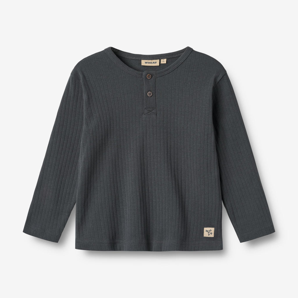 Langarmet T-skjorte i myk økologisk bomull for juniorbarnet.- Normal passform- Splitt i fronten med to knapperWheats T-skjorter er et virkelig essensielt plagg i barnets garderobe, da t-skjortene er myke og komfortable å ha på for barnet ditt. De kan enkelt styles med et par bukser eller en skjørt, og med en strikk på toppen avhengig av været og anledningen.